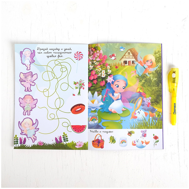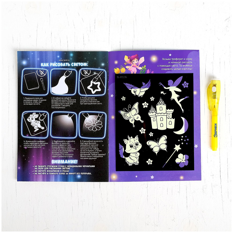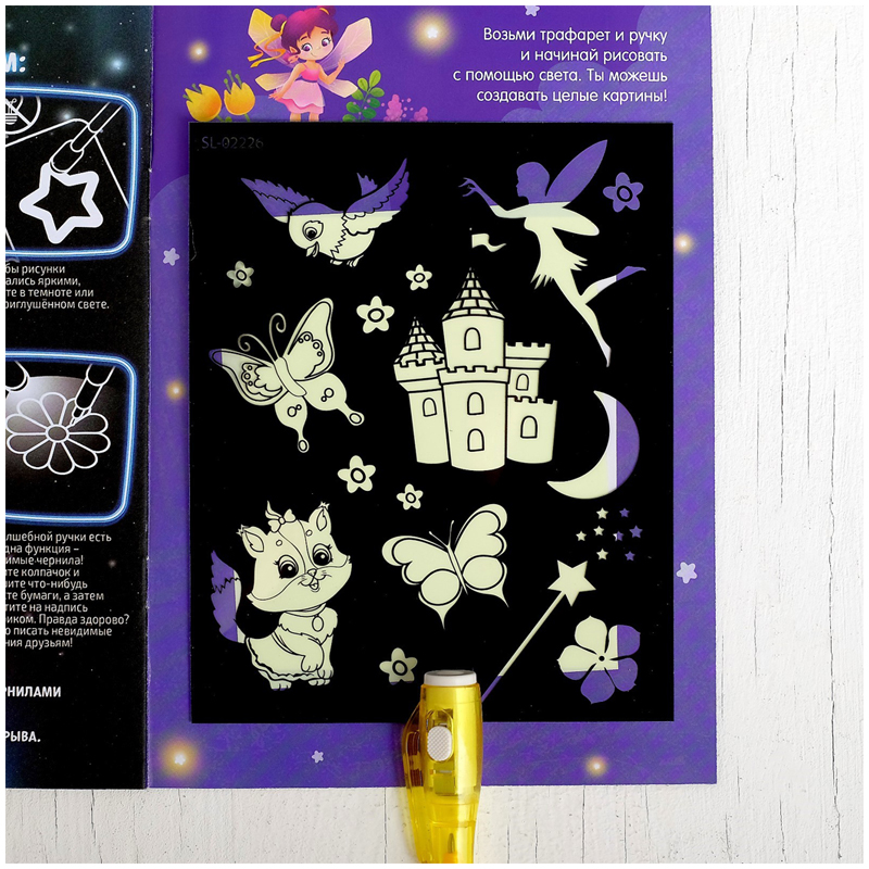 С помощью активити-книжки и специального маркера ребёнок научится рисовать светом. Малыш будет создавать картинки, используя трафареты, или придумает собственные сюжеты.<br/>Чтобы рисунки получались яркими, рисуйте в темноте или при приглушённом свете.<br/>У волшебной ручки есть ещё одна функция — невидимые чернила. Снимите колпачок и напишите что-нибудь на листе бумаги, а затем посветите на надпись фонариком. Рисунок проявится.