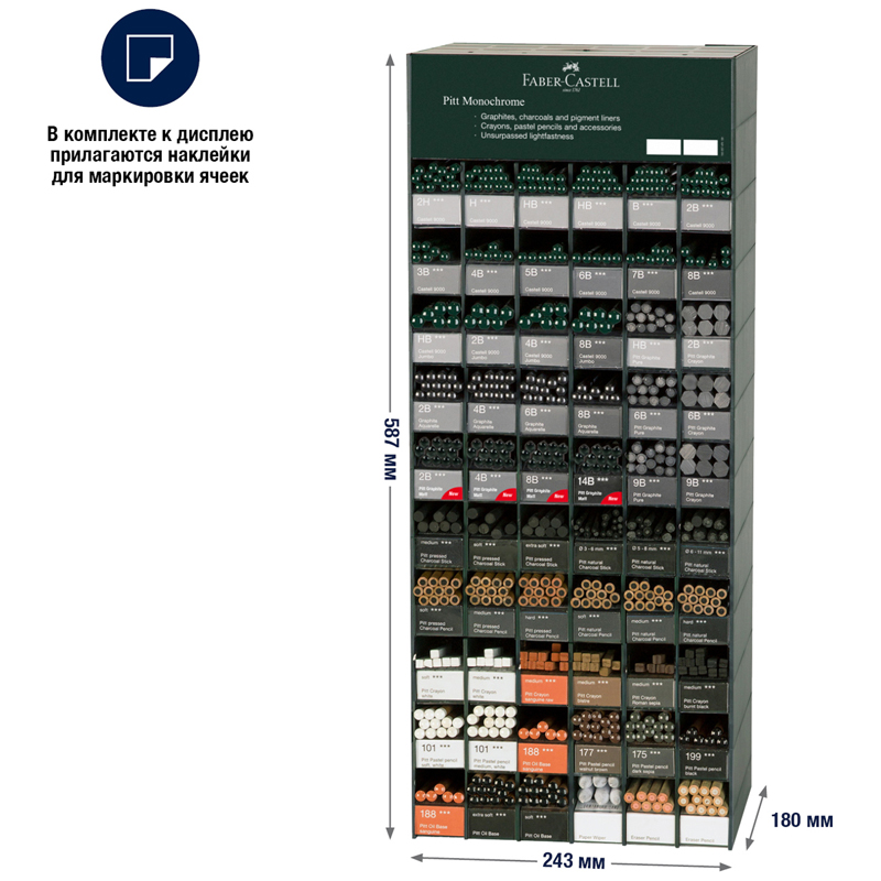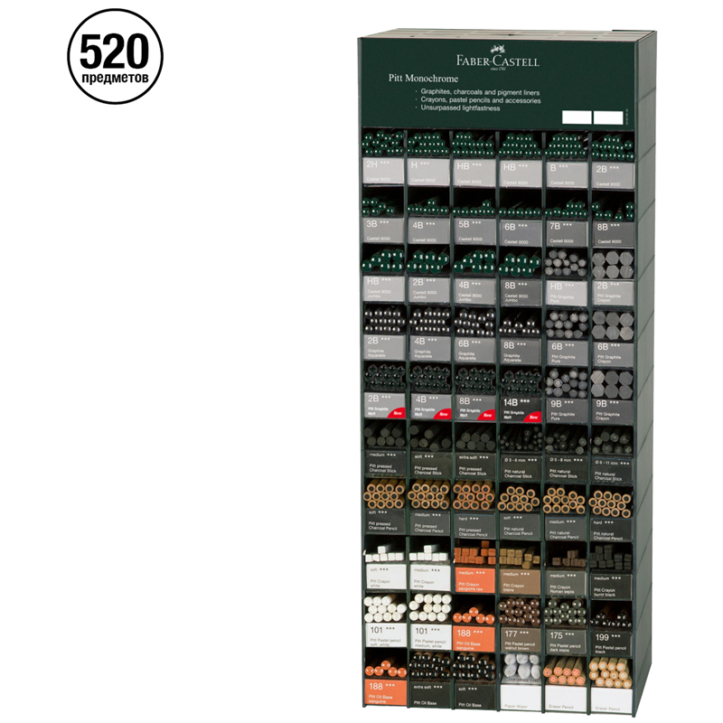 Дисплей художественных принадлежностей "Pitt Monochrome" от Faber-Castell состоит из 520 предметов для творчества серии "Monochrome". <br/>В дисплее графиты, угли и пигментные линеры, мелки, пастельные карандаши и аксессуары. Дисплей состоит из 1 модуля. <br/>В комплекте к дисплею прилагаются наклейки для маркировки ячеек.<br/>Размер дисплея: 243 х 587 х 180<br/>Штрихкод наполнения - 4005401126652