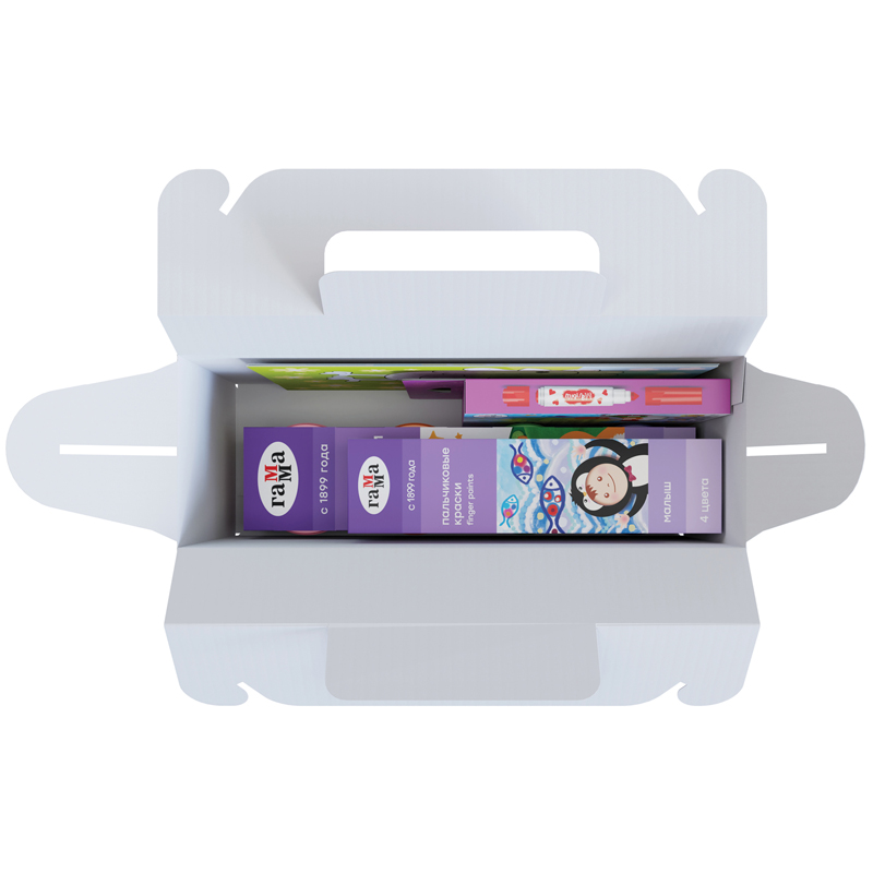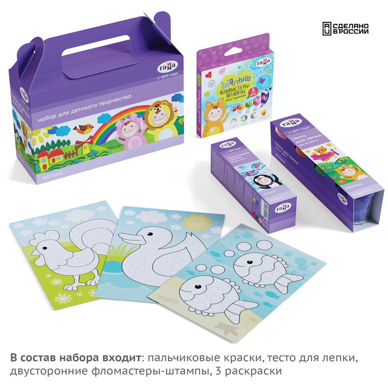 Набор принадлежностей для рисования и творчества ГАММА «Набор для детского творчества «Малыш» создан специально для маленьких начинающих художников. Серия «Малыш» — это новое поколение безопасных продуктов для раннего развития, разработанных на основе натуральных компонентов. Занятия творчеством с раннего возраста развивают цветовое восприятие, мелкую моторику, воображение и пространственный интеллект. Он состоит из 6 предметов, размер коробки – 23,5*8,8*22 см. <br/>В состав набора вошли: пальчиковые краски 4 цвета, 40 мл, тесто для лепки 4 цвета, 60 г, яркие цвета, двусторонние фломастеры-штампы 8 цветов, 3 раскраски на картоне, формат А5.