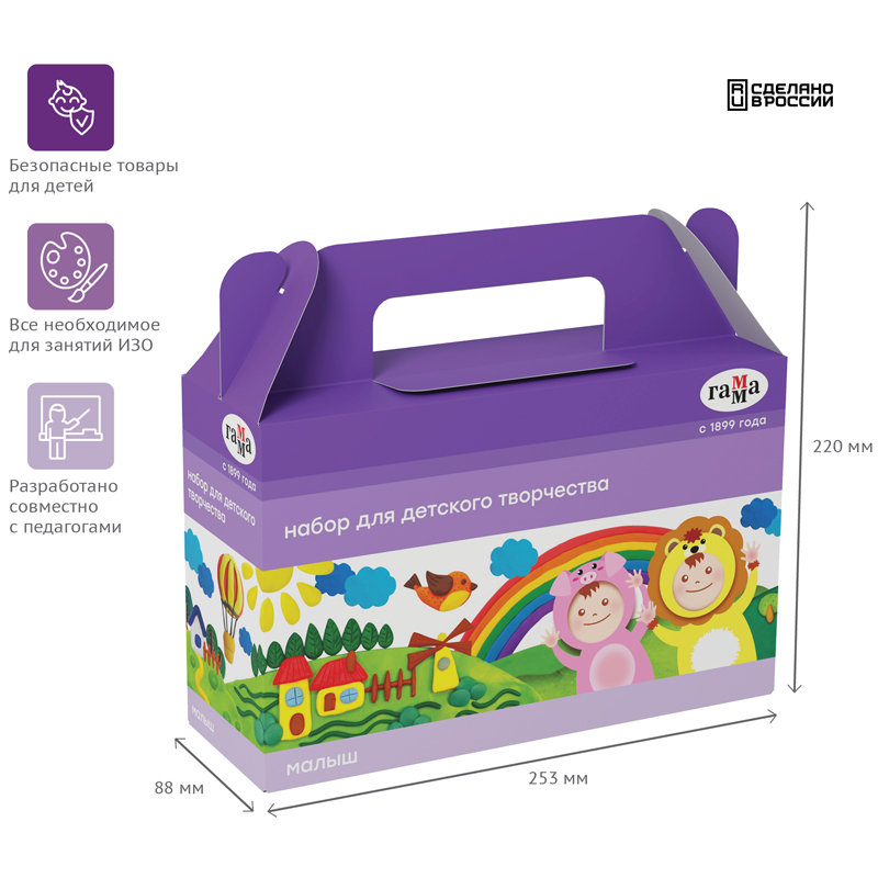 Набор принадлежностей для рисования и творчества ГАММА «Набор для детского творчества «Малыш» создан специально для маленьких начинающих художников. Серия «Малыш» — это новое поколение безопасных продуктов для раннего развития, разработанных на основе натуральных компонентов. Занятия творчеством с раннего возраста развивают цветовое восприятие, мелкую моторику, воображение и пространственный интеллект. Он состоит из 6 предметов, размер коробки – 23,5*8,8*22 см.