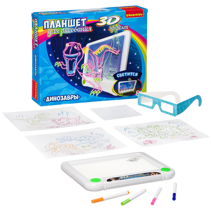 Развивает моторику, креативное и пространственное мышление, фантазию, кругозор. Это прекрасный подарок для ребенка, который любит рисовать или только пытается начать это делать.<br/>Рисовать очень легко - достаточно вставить один из трафаретов в планшет и перенести рисунок, используя для этого цветные маркеры, входящие в комплект. Маркеры заполнены флуоресцентной краской, в светодиодном свете они будут "сиять", усиливая эффект. Для того чтобы насладиться 3D эффектом, достаточно надеть очки, также имеющиеся в наборе. Можно выключить свет - тогда рисунок на доске будет выглядеть еще красочнее и впечатляюще.<br/>Линии от маркеров легко стираются мягкой тканью, что дает возможность, как исправлять мелкие ошибки, так и менять изображение полностью. Подставка включается с помощью кнопки, работает от батареек 3*ААА (не входит в комплект)<br/>В комплект входит: фломастер – 4 шт., картинка-трафарет – 3 шт., очки, планшет-доска, салфетка.