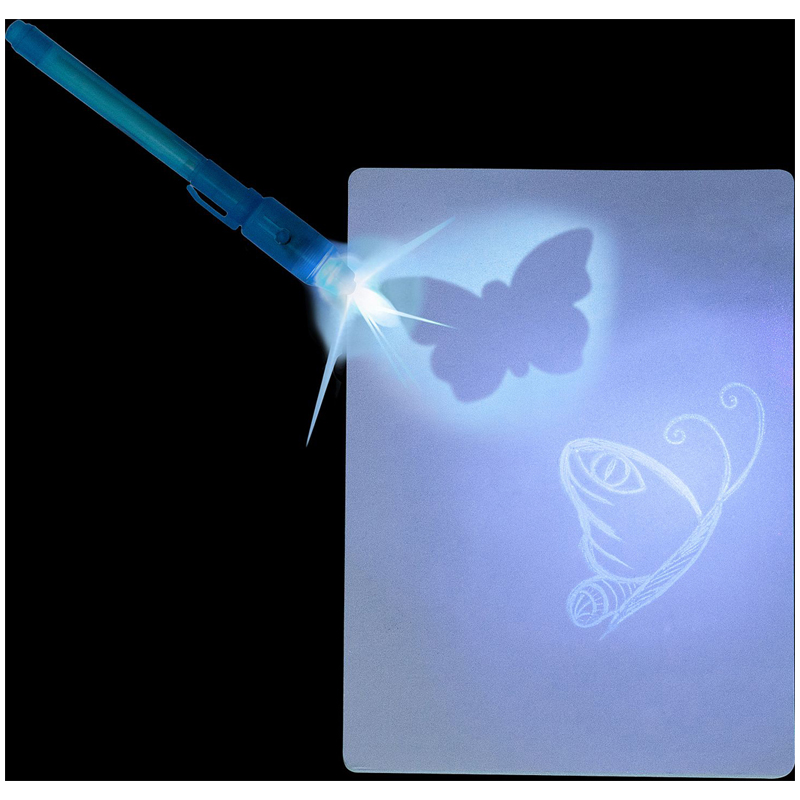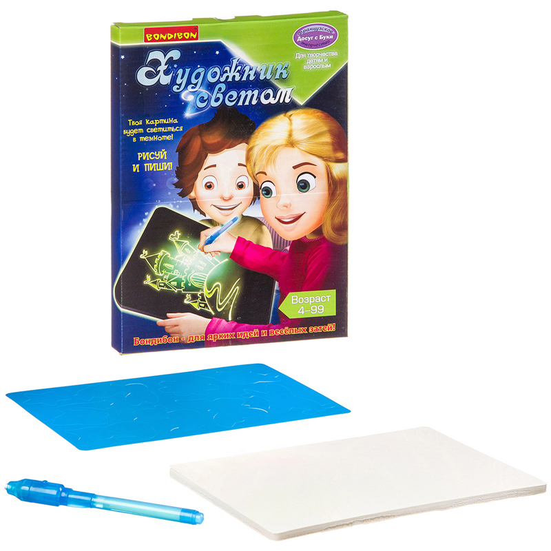 Сотворите настоящее произведение искусства в темноте! Набор имеет два режима рисования: в темноте и тайнопись. Режим рисования в темноте: держите кнопку на маркере нажатой и рисуйте, даже не прикасаясь к планшету. Яркость и чёткость рисунка будет увеличиваться по мере приближения маркера к поверхности планшета. Толщина линий зависит от угла наклона маркера. Перпендикулярное положение маркера к планшету обеспечит наиболее яркий и чёткий рисунок. Изображения могут перекрывать друг друга. Каждое новое изображение будет ярче предыдущего. Режим тайнописи на свету: снимите колпачок со светодиодом с маркера и напишите на бумаге невидимыми чернилами. Направьте светодиодный маркер на тайное письмо, и всё тайное станет явным. В состав набора входит: планшет для рисования и письма светодиодным маркером, светодиодный маркер со стержнем для тайнописи, трафареты.