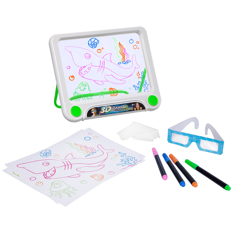 Развивает моторику, креативное и пространственное мышление, фантазию, кругозор. Это прекрасный подарок для ребенка, который любит рисовать или только пытается начать это делать.<br/>Рисовать очень легко - достаточно вставить один из трафаретов в планшет и перенести рисунок, используя для этого цветные маркеры, входящие в комплект. Маркеры заполнены флуоресцентной краской, в светодиодном свете они будут "сиять", усиливая эффект. Для того чтобы насладиться 3D эффектом, достаточно надеть очки, также имеющиеся в наборе. Можно выключить свет - тогда рисунок на доске будет выглядеть еще красочнее и впечатляюще.<br/>Линии от маркеров легко стираются мягкой тканью, что дает возможность, как исправлять мелкие ошибки, так и менять изображение полностью. Подставка включается с помощью кнопки, работает от батареек 3*ААА (не входит в комплект)<br/>В комплект входит: фломастер – 4 шт., картинка-трафарет – 3 шт., очки, планшет-доска, салфетка.