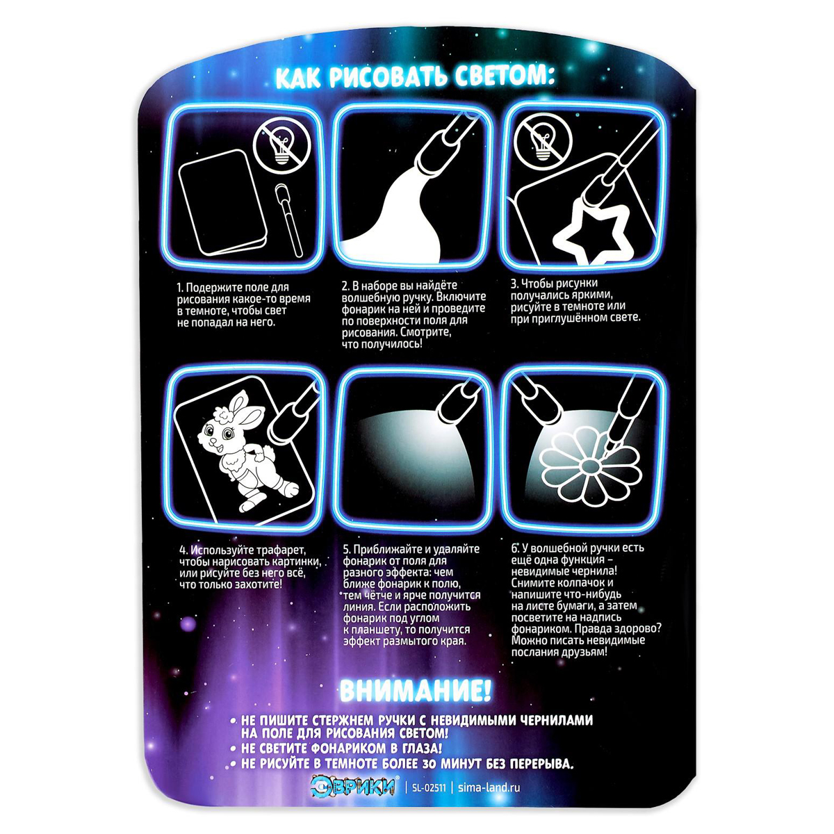 С помощью специального маркера ребёнок научится рисовать светом. Малыш будет создавать картинки, используя трафареты, или придумает собственные сюжеты.<br/>Чтобы рисунки получались яркими, рисуйте в темноте или при приглушённом свете.<br/>У волшебной ручки есть ещё одна функция — невидимые чернила. Снимите колпачок и напишите что-нибудь на листе бумаги, а затем посветите на надпись фонариком. Рисунок проявится.