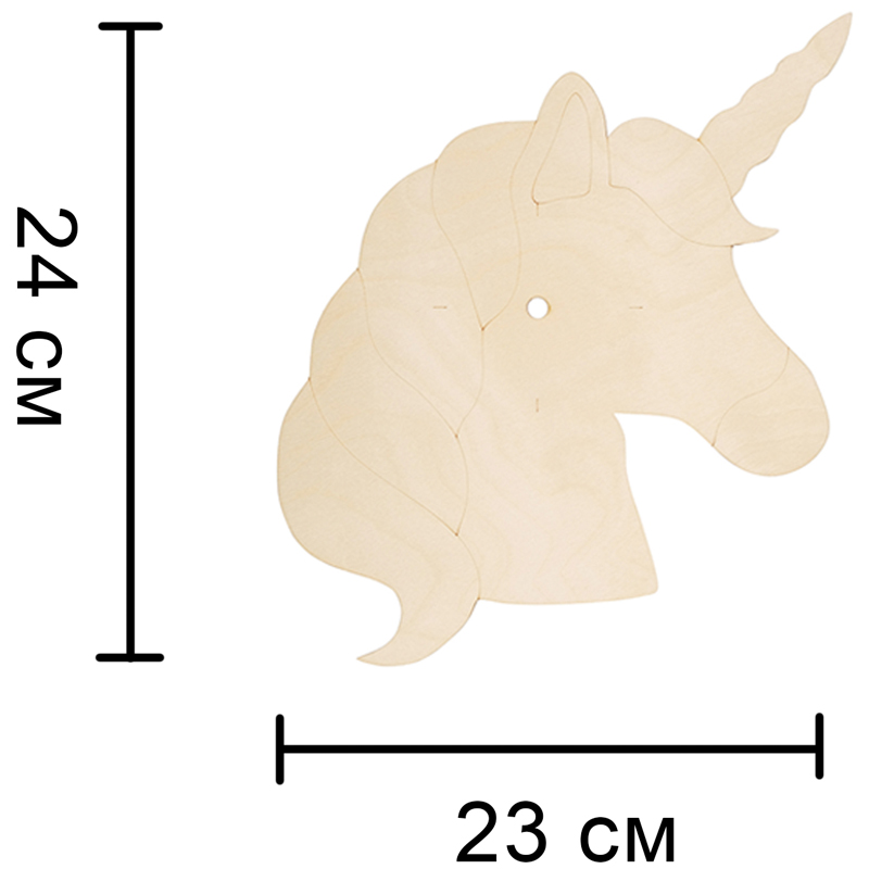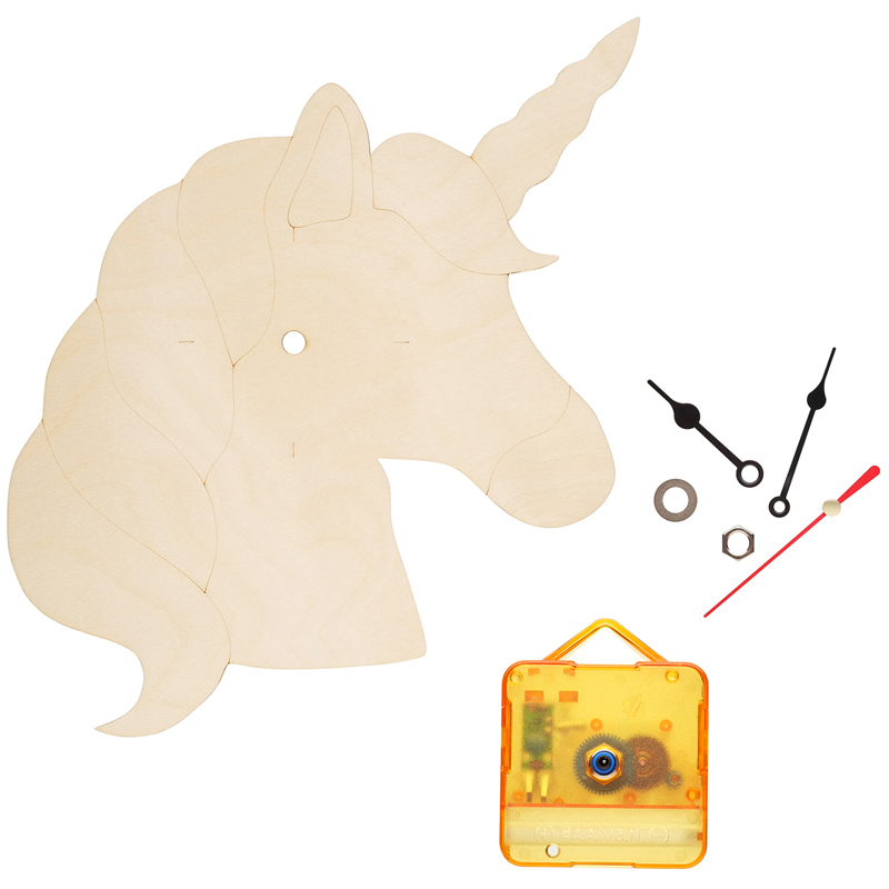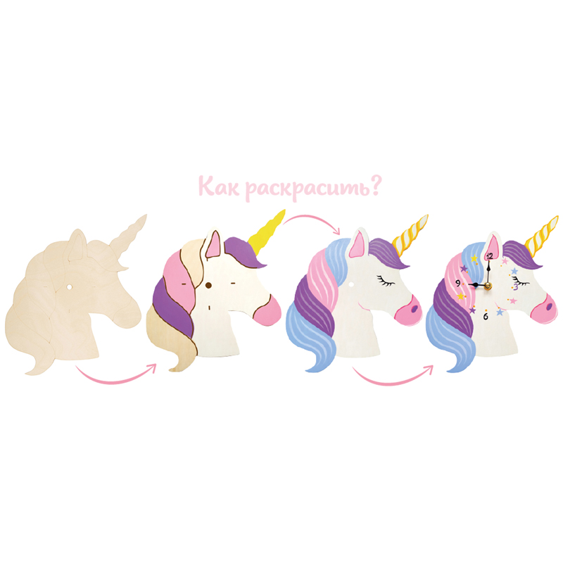 Часы-раскраска с циферблатом в форме единорога замечательный подарок для всех, кто верит в чудеса! Такой оригинальный сувенир можно сделать своими руками. Внутри красивой коробки: деревянная заготовка, часовой механизм, краски и кисточка. Придумайте дизайн для вашего авторского сувенира или воспользуйтесь схемой раскрашивания, которая размещена на коробке. <br/>Готовый часовой механизм и стрелки легко крепятся к циферблату, ребенок справится самостоятельно или с помощью взрослого. Часы точные, поэтому результатом творчества станет не просто стильный декор интерьера, но и полезная, функциональная вещь.<br/>В наборе: деревянная заготовка под раскрашивание, часовой механизм, краски и кисточка.<br/>Для работы часового механизма дополнительно понадобится батарейка типа АА (в комплект не входит)<br/>Состав: дерево, пластик, акриловая краска<br/>Размер заготовки: 23х24 см<br/>Размер упаковки: 30х21х3 см