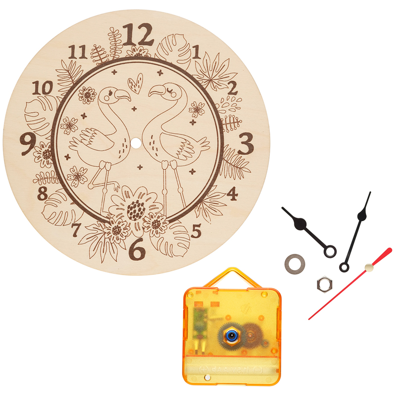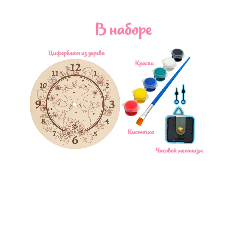 В наборе: деревянная заготовка под раскрашивание, часовой механизм, краски и кисточка