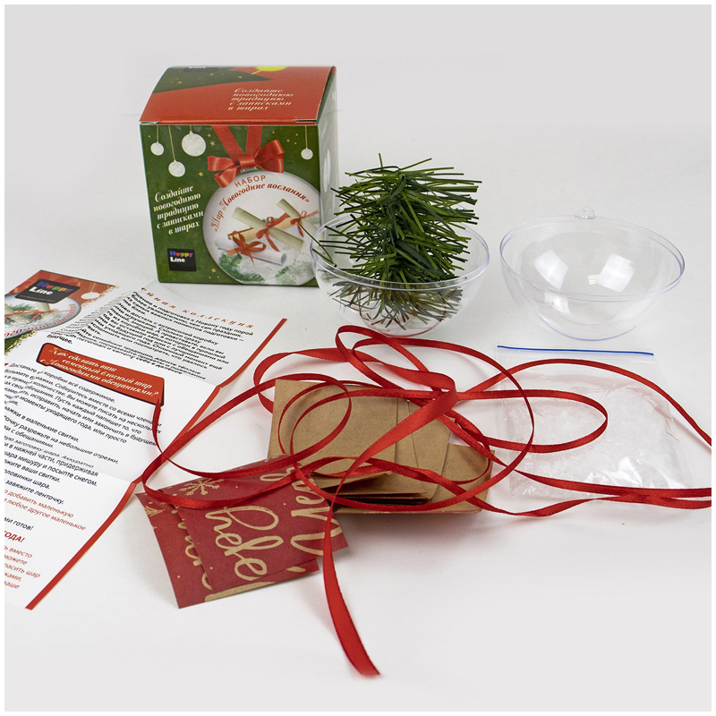 Набор «Шар. Новогодние послания». Состав: заготовка шара из прозрачного пластика – 1 шт. (диаметр – 7 см), лента красного цвета, бумажки для записок, ёлочная мишура, искусственный снег ПВХ, инструкция. Материал: пластмасса, текстильный материал, картон, бумага. Для подростков от 14 лет. Изготавливая ёлочные украшения своими руками, мы развиваем творческую фантазию, мелкую моторику, усидчивость, концентрацию, терпение и создаём свою уникальную игрушку.