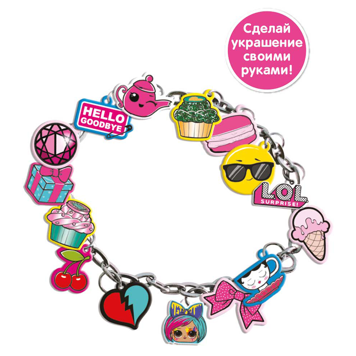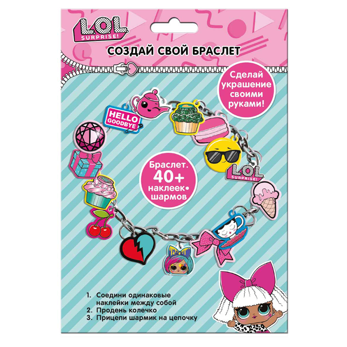 Набор для творчества "создай свой браслет" увлекательное занятие для каждой модницы. В наборе есть все необходимое для создания украшения - браслет, стикеры-шармы, колечки.<br/>браслет, наклейки, колечки, упаковка пакет