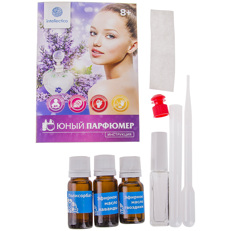 Юный парфюмер мини. "Лаванда" (Аромат лаванды завораживает; вдохнув этот запах - им хочется дышать, ощущать радость. В данном наборе аромат лаванды дополняет пряная гвоздика. Духи с таким ароматом сделают вас романтичными, мечтательными и красивыми.) В набор входит эфирное масло "Лаванда", эфирное масло "Гвоздика", полисорбат-20, пробирка стеклянная с пробкой, пипетка Пастера, флакон-спрей, блоттеры, инструкция
