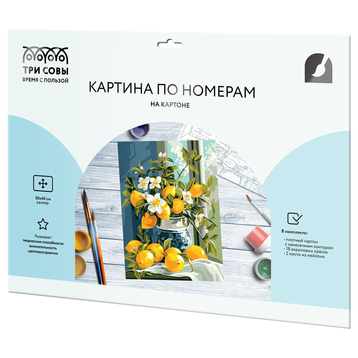 Картина по номерам на картоне бренда «ТРИ СОВЫ» станет увлекательным хобби, которое будет интересно как детям, так и взрослым.<br/>В набор входят:<br/>1. Плотный картон с тиснением под холст размером 30х40 см с нанесенным контуром, пронумерованный в соответствии с номерами красок;<br/>2. 18 акриловых красок на водной основе в пронумерованных баночках;<br/>3. Кисти из эластичного нейлонового волокна 2 штуки: малая и средняя;<br/>Краски обладают высокой плотностью, что позволяет перекрыть нанесенный контур в 1 слой. Технология точной разбивки сюжета картины на разные цветовые оттенки гарантируют правильность выполнения рисунка. Законченная работа с изображением лимонов в цветах займет почетное место в интерьере или станет отличным подарком. Тренировочный лист скачивается по QR-коду, расположенному на упаковке.<br/>Рисование по номерам способствует развитию внимания, учит концентрации и аккуратности, помогает понять, как построить фигуру через цветовые оттенки, развивает чувство вкуса. Художником может быть каждый!<br/>«ТРИ СОВЫ» – время с пользой!<br/>• Основа: картон;<br/>• Формат: А3;<br/>• Размер: 30*40 см;<br/>• Количество баночек с красками: 18.<br/><br/>Причина уценки: механические повреждения упаковки.