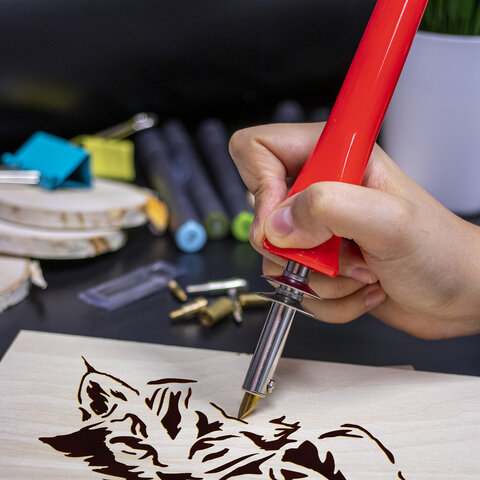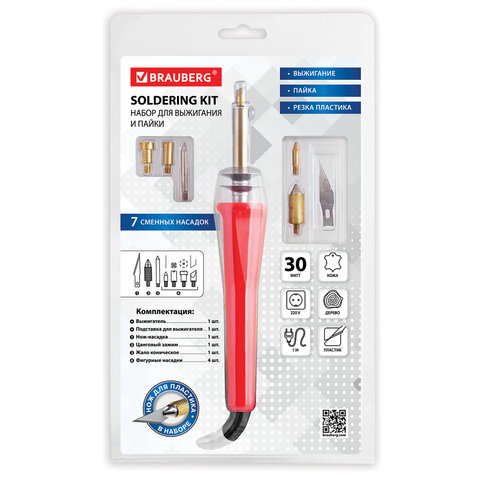 Набор для выжигания и пайки BRAUBERG отлично подходит для выполнения мелких паяльных работ и выжигания рисунков по дереву и на натуральной коже. Возможна резка пластика – для этого в набор входит специальный нож для резки пластмасс и цанговый зажим.