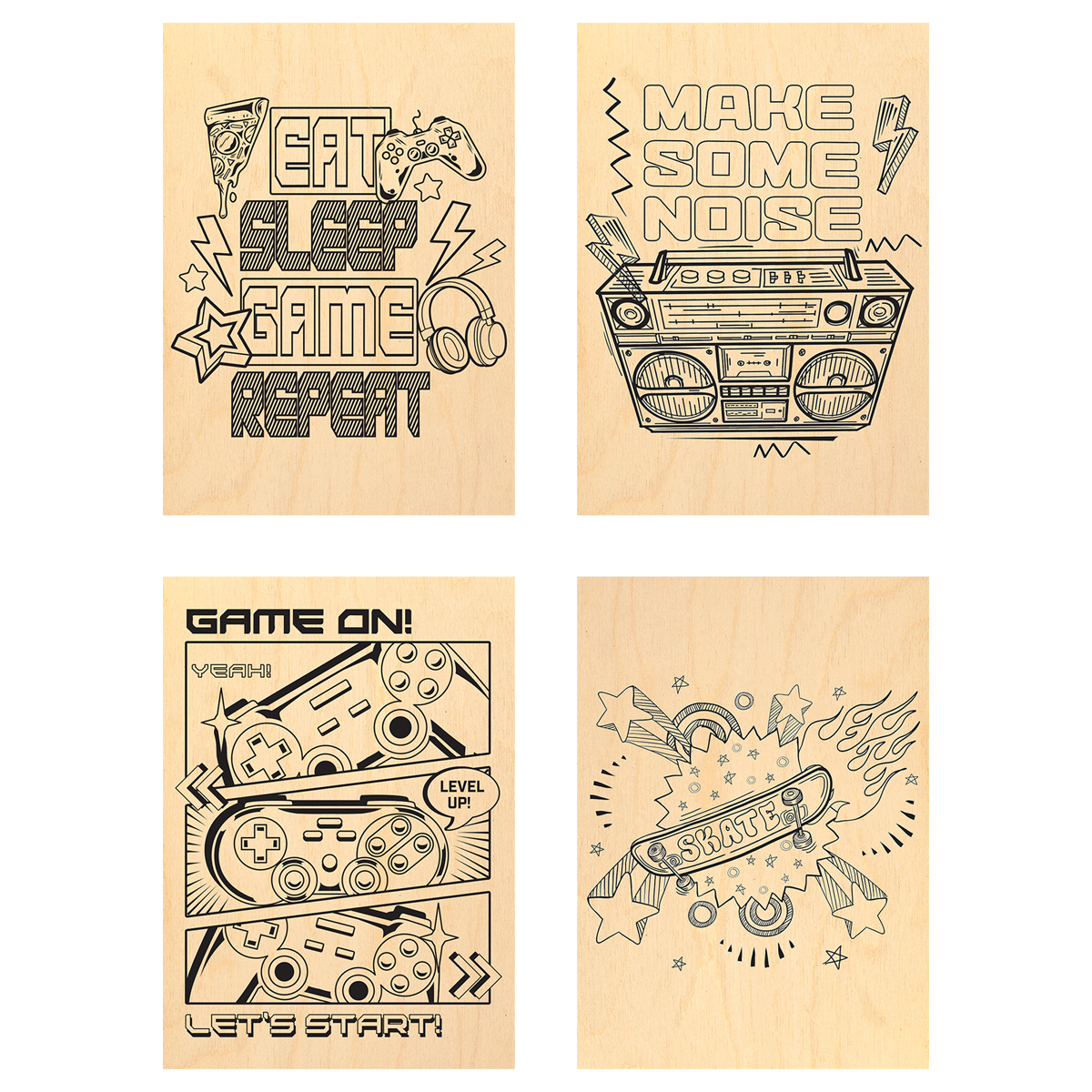 Для детей выжигание по дереву особенно полезно. Это творческое занятие развивает у них не только воображение, но и усидчивость, терпение, целеустремлённость, уверенные навыки мелкой моторики рук и пальцев. В наборе 4 прямоугольных основы из фанеры. Размер – 21,3*14,8 см. Упакован в пакет с европодвесом.
