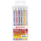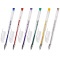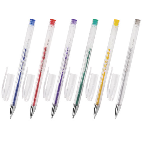 Ручка имеет круглый прозрачный корпус и рифление в зоне захвата для удобства письма. Сменный стержень длиной 135 мм со стандартным наконечником позволит использовать ручку максимально долго. Диаметр пишущего узла, равный 1,0 мм, создает линию письма, равную 0,8 мм. Набор включает гелевые ручки из 6 различных цветов чернил с блёстками: синий, красный, фиолетовый, зеленый, желтый, серебристый. Рекомендован для детского творчества.