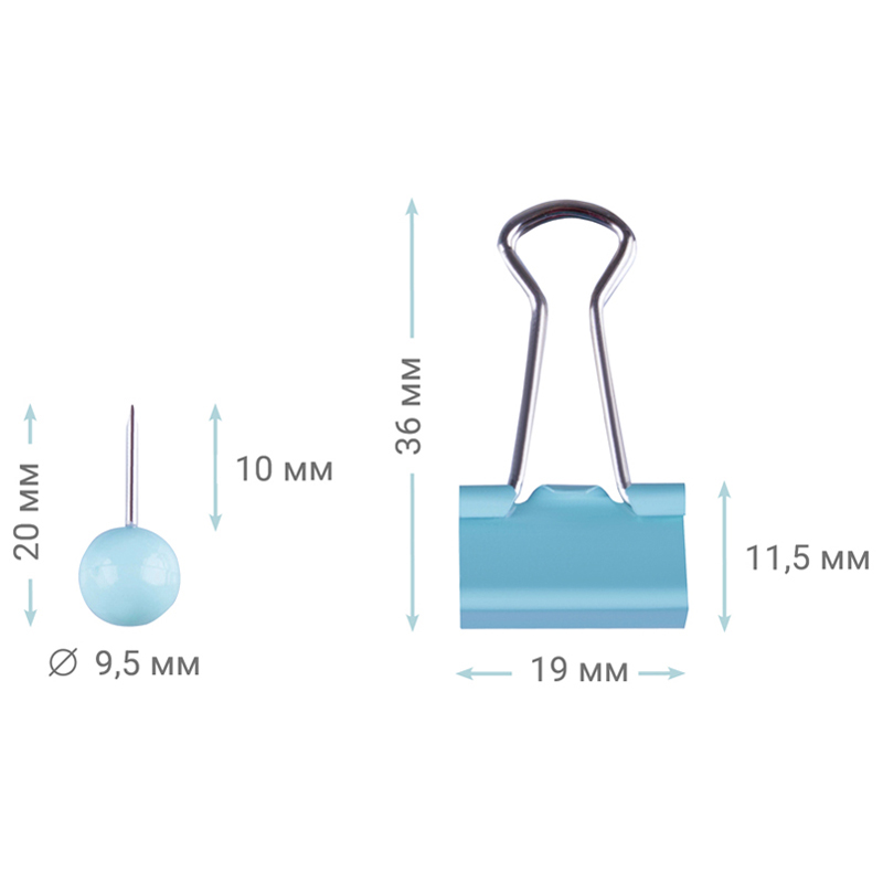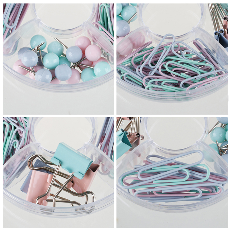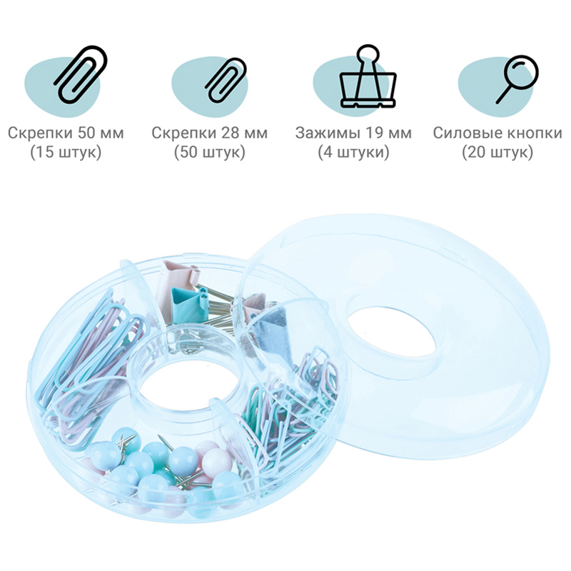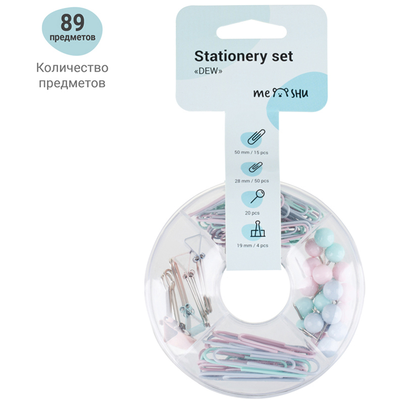 Набор канцелярских принадлежностей Meshu Dew включает в себя: зажимы 19 мм (4 штуки), скрепки с виниловым покрытием 28 мм (50 штук), скрепки с виниловым покрытием 50 мм (15 штук), силовые кнопки (20 штук). Выполнен в цветовой гамме нежных пастельных цветов (мятный, розовый и голубой). Все элементы упакованы в стильный пластиковый пенал с удобным замком и отделениями для каждого вида товара, который идеально подойдет для хранения принадлежностей. Упаковка набора - картонный подвес.