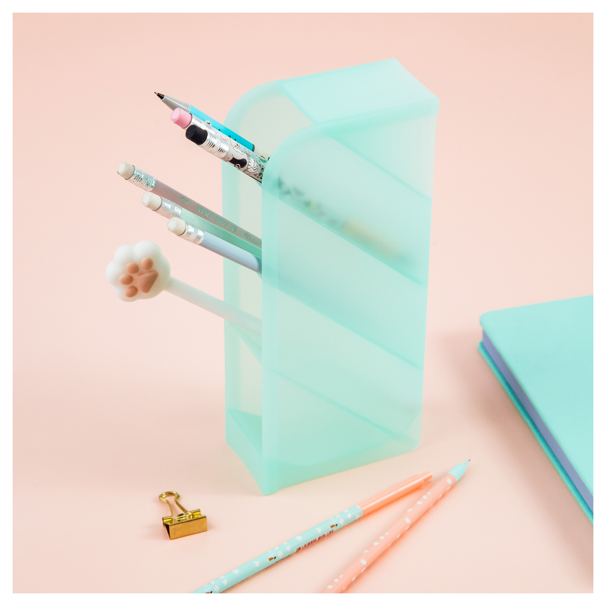 Настольная подставка MESHU на 4 секции в мятном цвете предназначена для хранения пишущих принадлежностей и канцелярских мелочей. Размер – 5*8,5*20 см. Подставка изготовлена из пластика. Её можно расположить как вертикально, так и горизонтально. Упакована в термоусадочную пленку.