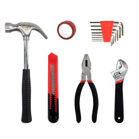 Инструменты изготовлены из закалённой углеродистой стали. Рукоятки выполнены из нескользящего ПВХ для максимального комфорта и безопасности во время использования. В состав набора входят инструменты, необходимые в столярно-слесарном деле, для ремонта колесной техники, бытовой техники, а также мебели.