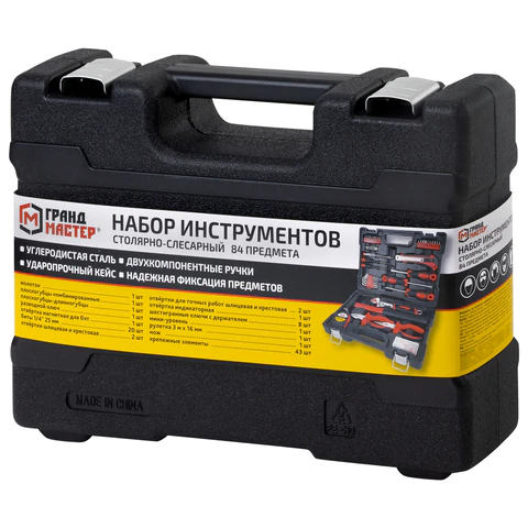 Столярно-слесарный набор ГРАНДМАСТЕР включает в себя необходимые инструменты для использования в быту. Состав набора позволит выполнить мелкий ремонт дома и на даче, а также пригодится для ремонта колесной и бытовой техники.