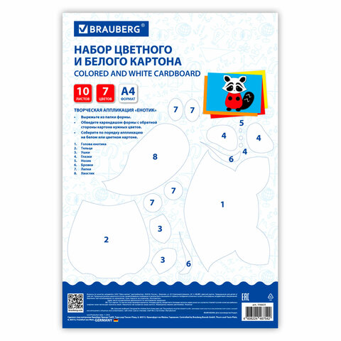 Набор белого и цветного картона BRAUBERG предназначен для творчества и хобби и может использоваться детьми с трехлетнего возраста. Картон рекомендован для уроков труда и технологии. Творческая инструкция по созданию аппликации на обороте.
