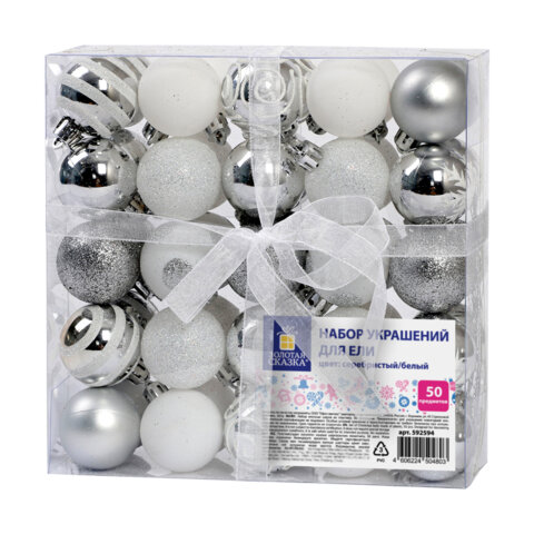 Шары елочные НАБОР 50 предметов "Новогодняя Сказка", пластик, золото/белый, ЗОЛОТАЯ СКАЗКА, 592593