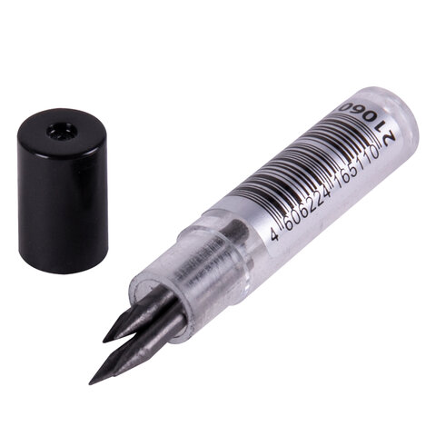 Представляют собой графит средней степени твердости – HB. Длина грифеля составляет 17 мм, а его толщина - 2 мм. 4 штуки в упаковке. Поставляются в пластиковой тубе.