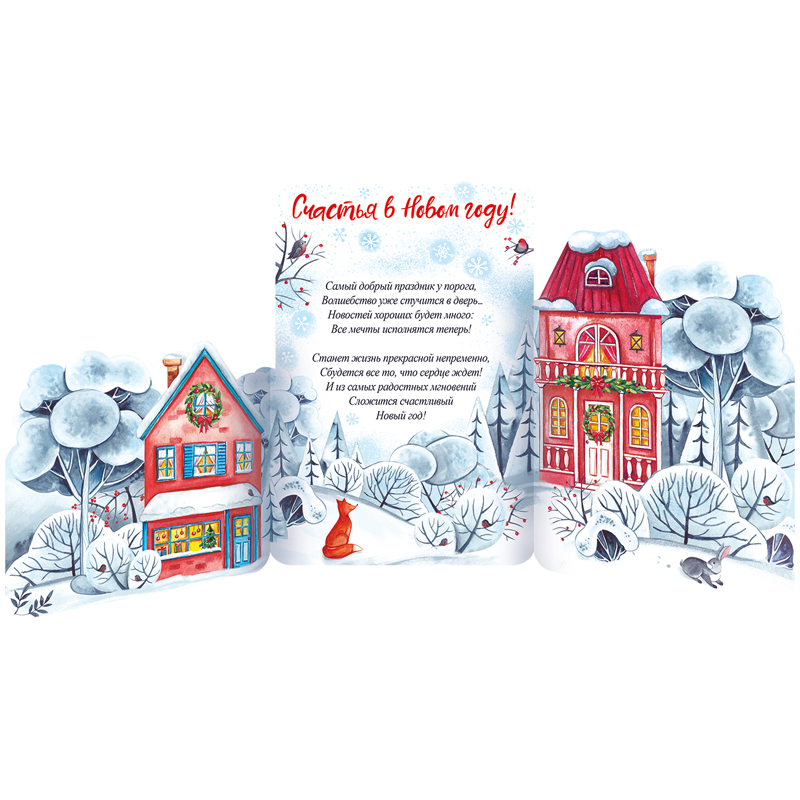 Открытка с готовым текстом - поздравлением внутри. На лицевой стороне располагается надпись "Счастья в Новом году!". Фасовка по 10 шт. Размер изделия: 122*182 мм