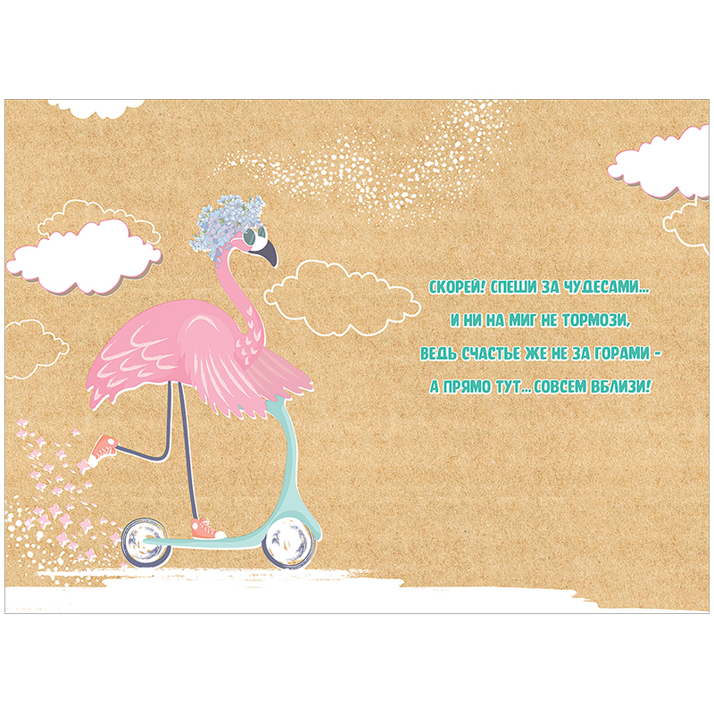 Открытка с готовым текстом - поздравлением внутри. На лицевой стороне располагается надпись «С Днем рождения! Мечта прямо по курсу!». Фасовка по 10 шт. Размер изделия: 126*182 мм