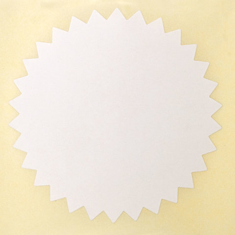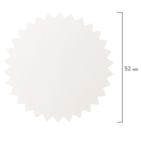 Матовые наклейки «звездочки» для сшивки документов имеют круглую форму тридцати конечной звезды и имеют стандартный диаметр 52 мм, что является основным стандартом во всем мире. Специальный клеевой слой обеспечивает отличное прилипание и сцепление с поверхностью документа, которые не позволяют удалять этикетку без её разрыва. При попытке отклеивания бумага разрушается. Документ, который содержит более одного листа, сшивается нитью, после чего скрепляется нотариальной «звездочкой». Сверху на нее ставится печать нотариуса либо компании. Такой документ будет иметь официальный внешний вид и надежную защиту от подмены листов.