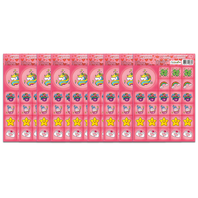 На каждом листе 27 мотивирующих наклеек и при этом одна из них СУПЕР-наклейка. В набор входит 10 листов наклеек (27 наклеек на каждом листе). Общее количество - 270 наклеек. Упакован в пакет с европодвесом.