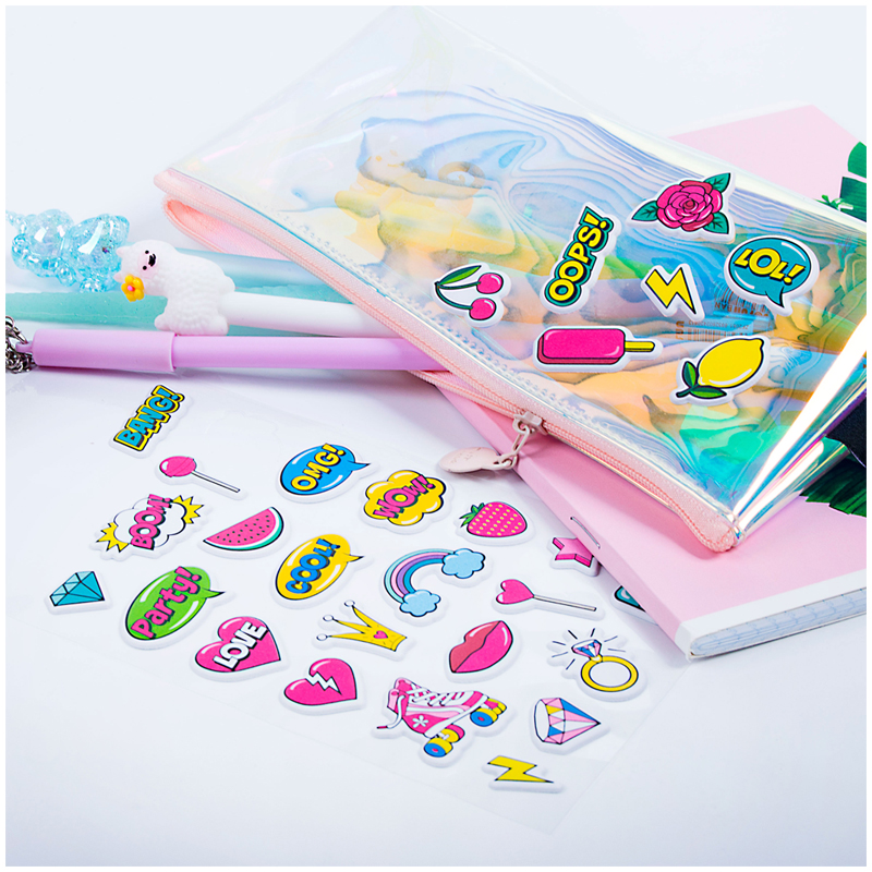 Яркие, объёмные наклейки для декорирования. Идеально подходят для украшения любых поделок, их можно приклеить на открытку, подарочную упаковку, канцтовары, предметы интерьера, мобильный телефон, ноутбук или любой другой аксессуар. Легко отделяются от основы и надежно держатся.