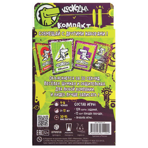 Задания всех тематических наборов компактного «Крокодила» выполняются по единым правилам. Все наборы совместимы между собой: вы можете свободно смешивать карточки с заданиями (в том числе и с большим набором «Крокодил. Большая вечеринка»).