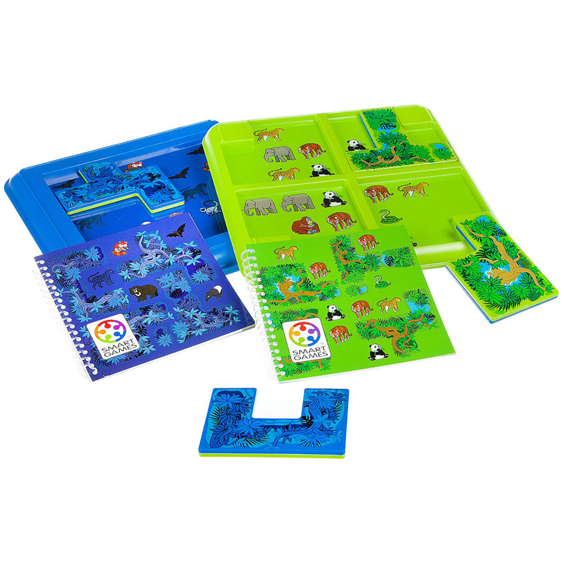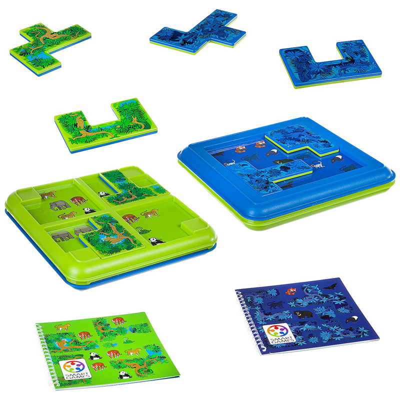 Откройте для себя новый мир животных джунглей! Можете ли вы, переставляя элементы, спрятать всех животных в джунглях кроме тех, которые показаны в вашем задании? Благодаря 80 заданиям и двухстороннему игровому полю, вы получаете две игры в одной: день в джунглях, когда игровое поле разделено на 4 области, и ночь в джунглях, с более сложными заданиями на одном большом игровом пространстве. Игра развивает логическое мышление и его гибкость, познавательные способности, а также зрительное и пространственное восприятие.
