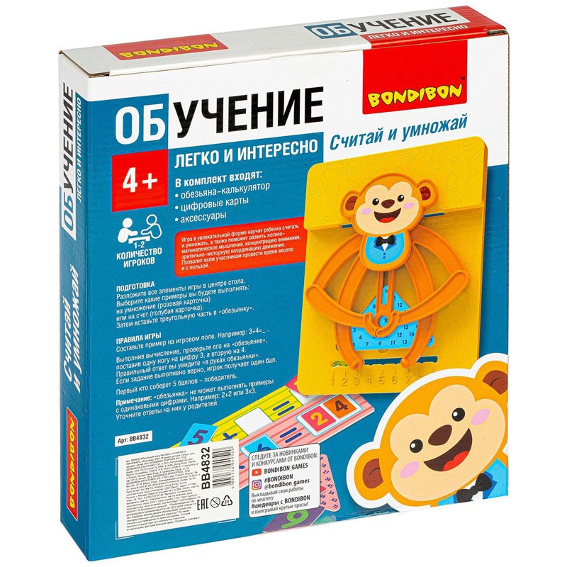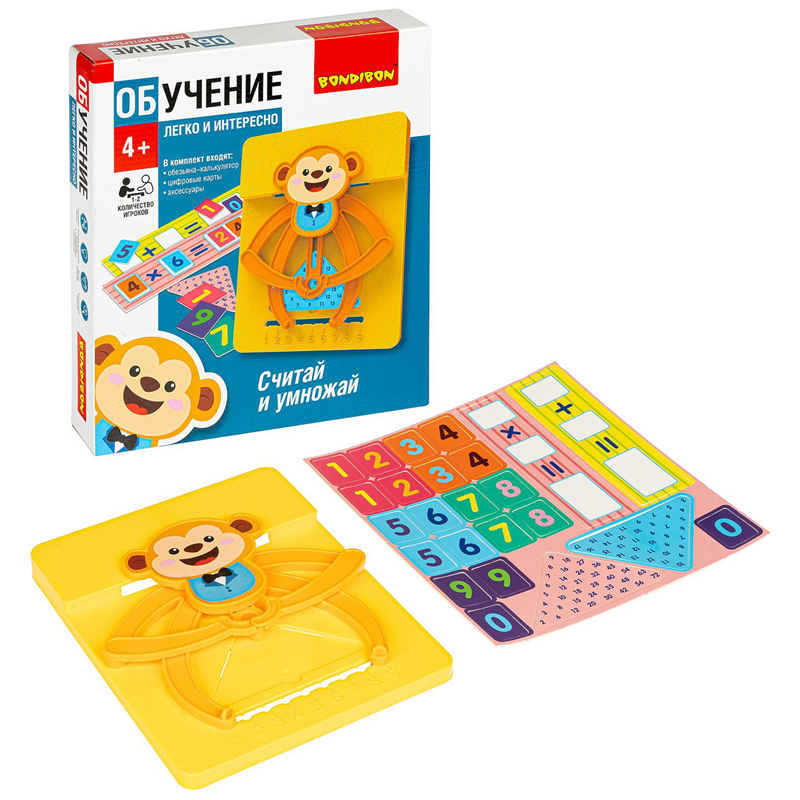 Игра «СЧИТАЙ И УМНОЖАЙ» в виде обезьянки позволяет тренировать математические навыки ребенка на умножение (розовая карточка), или на счет (голубая карточка). В комплект входят: игрушка-калькулятор, цифровые карты, аксессуары.<br/>Составьте пример на игровом поле. Например: 3+4=_ . Выполнив вычисление. проверьте его на "игрушке в виде животного", поставив одну ногу на цифру 3, а вторую на 4. Правильный ответ вы увидите «в руках животного». Если задание выполнено верно, игрок получает один бал. Первый кто соберет 5 баллов - победитель.<br/>Игра предназначена для детей от 4 лет. Играть можно одному или соревноваться, кто наберет больше правильных ответов, с друзьями. Примечание: «животное» не может выполнять примеры‚ с одинаковыми цифрами. Например, 2+2 или 3х3. Уточните ответы на них у родителей. В комплект входят: игрушка-калькулятор, цифровые карты, аксессуары.<br/>Легкое и интересное обучение - вместе с обучающими играми Bondibon.