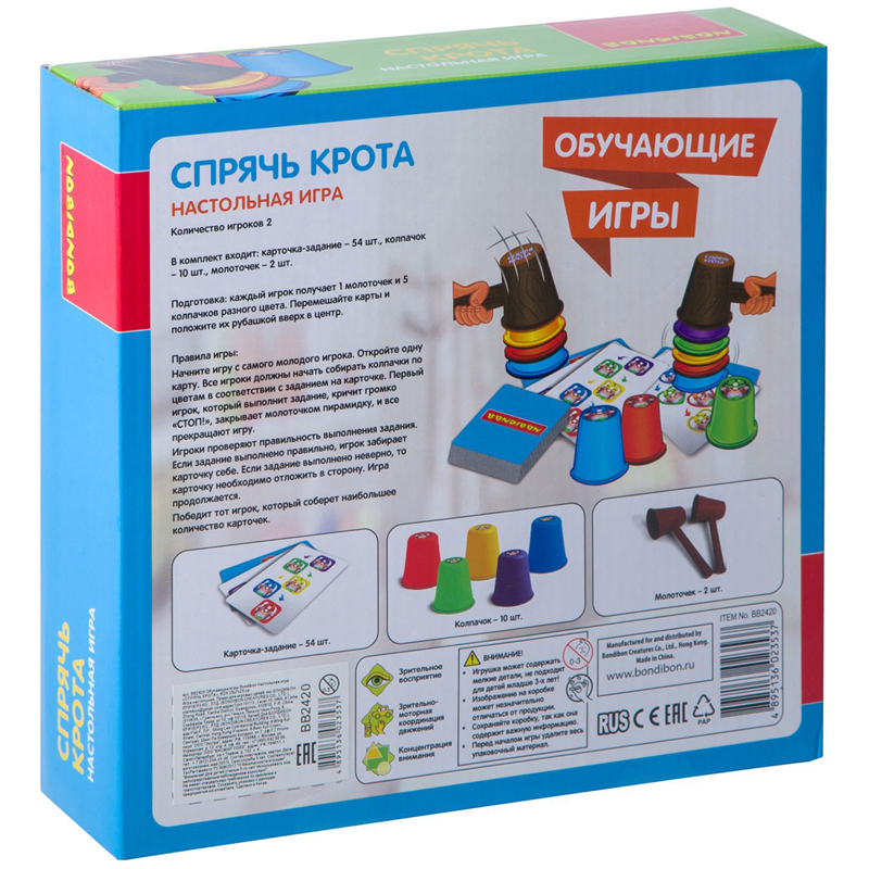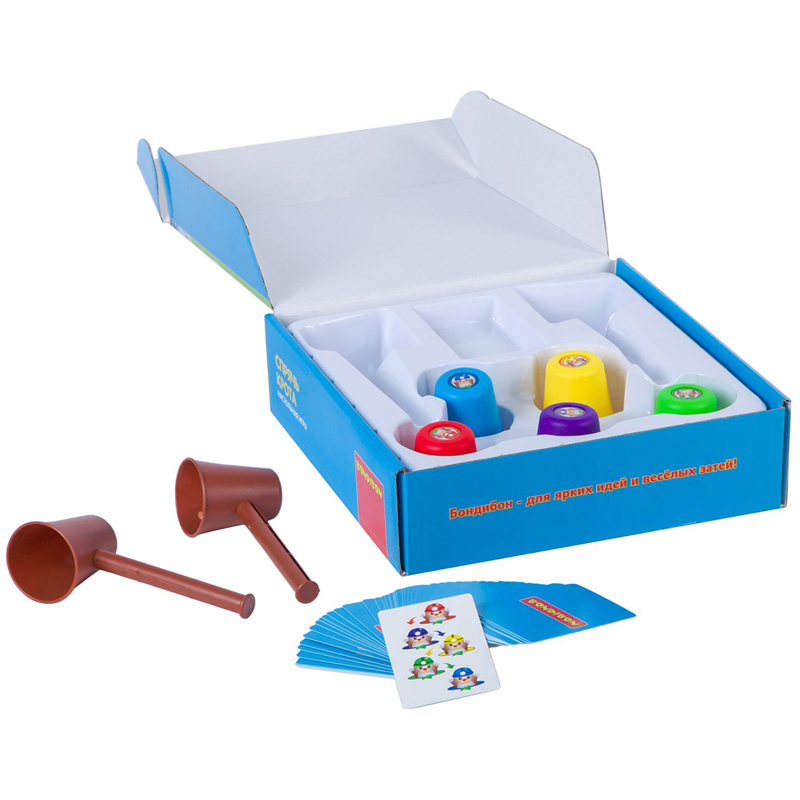 Проведите веселое время с пользой в кругу семьи и друзей! Соберите колпачки как можно быстрее в порядке, указанном на карточках с заданиями, и накройте молоточком пирамидку. В каждом раунде игроки соревнуются в правильности выполнения задания и в том, кто соберет наибольшее количество карточек. Игра на ловкость рук и остроту глаза. Способствует развитию зрительно-моторной координации движений, концентрации внимания и зрительного восприятия. В комплект входит карточка-задание 54 шт., колпачок 10 шт., молоточек 2 шт.