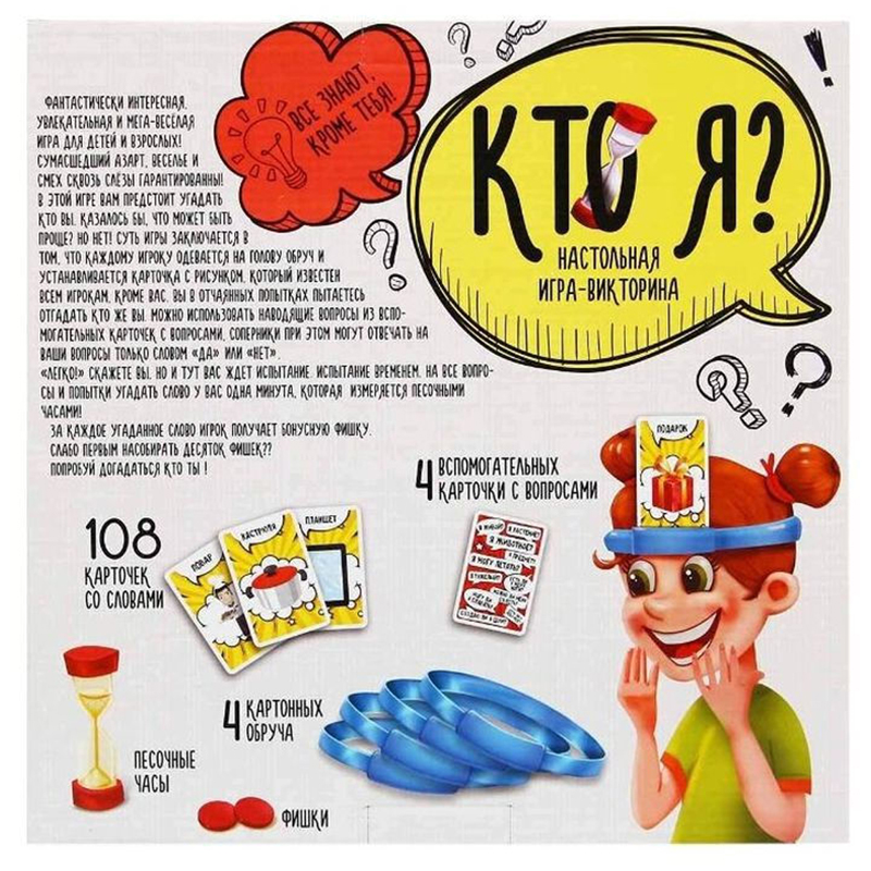 ФАНТАСТИЧЕСКИ интересная , увлекательная и МЕГА-ВЕСЁЛАЯ настольная игра Кто Я? для детей и взрослых! Сумасшедший азарт, веселье и смех сквозь…Вы в отчаянных попытках пытаетесь отгадать кто же вы. можно использовать наводящие вопросы из вспомогательных карточек с вопросами, соперники при этом могут отвечать на ваши вопросы только словом “Да” или “Нет”.
