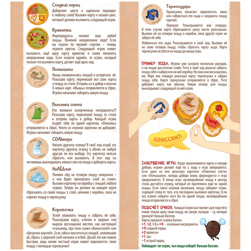 Простая и быстрая игра для компании друзей или семейного вечера научит побеждать, действовать быстро и никогда не унывать – просто приготовить новую пиццу! "Una pizza, per favore!" – а вот и новый заказ.