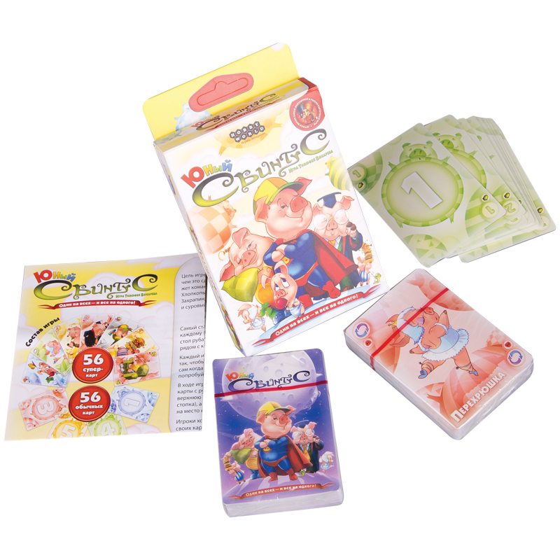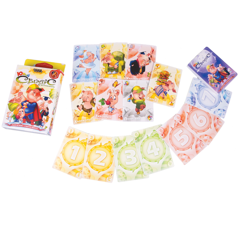 Настольная карточная игра для самых маленьких игроков. Цель игры избавиться от всех своих карт раньше, чем это сделают остальные игроки. Справиться с этой задачей поможет команда суперсвинтусов. Встречайте героев: молниеносный Хлопкопыт, загрубущий Хапёж, вертлявая Перехрюша, невозмутимый Захрапин, цветопомрачительный Полисвин, таинственный Тихохрюн и суровый Указявка. Игра тренирует внимательность и реакцию, а самых маленьких обучит цифрам от 0 до 5. Для компании из детей разного возраста она хороша тем, что этот показатель на победу не влияет: надо просто быть быстрее и глазастее остальных.