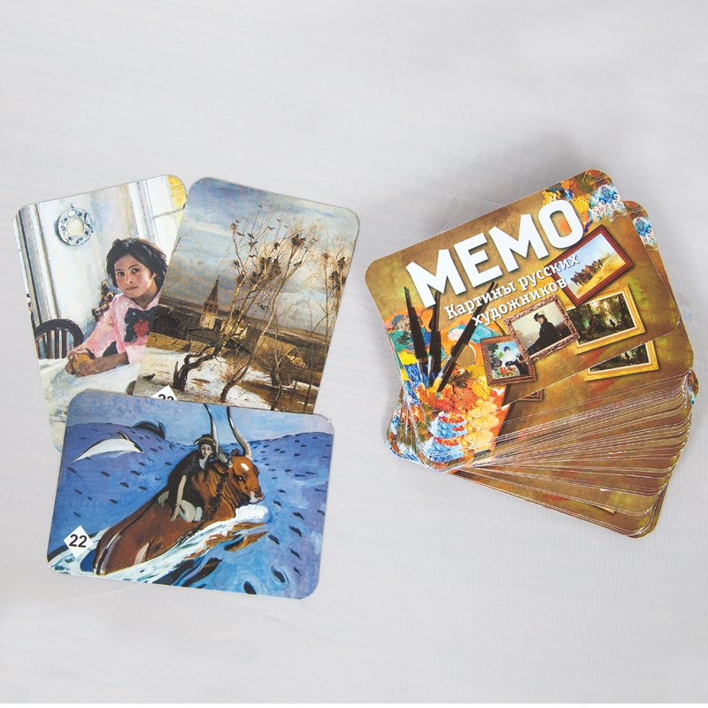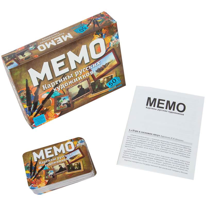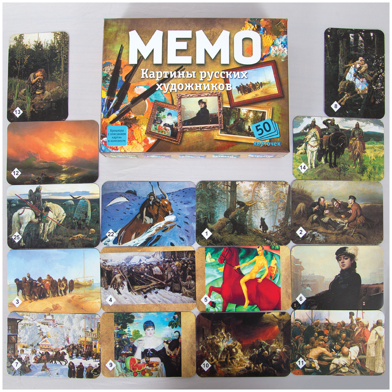 Обучающая настольная карточная игра Нескучные игры "Мемо. Картины русских художников" поможет развить память как ребенку, так и взрослому. Необходимо собрать как можно больше пар карточек, т.е. две карточки с одинаковой картинкой. Игра поможет расширить кругозор и познакомиться с изображенными на карточках картинами известных русских художников. Благодаря компактности игра также отлично подойдет для игры в поездках. В наборе 50 ярких карточек и брошюра с описанием всех картин.