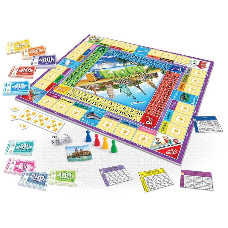 Если вы любите путешествовать и открывать для себя новые города и страны, любоваться природой и архитектурой, то это увлечение можно превратить в доходный и успешный БИЗНЕС. Откройте свое Бюро Путешествий и победите всех конкурентов, получив звание лучшего туроператора. Игра рассчитана на 2-4 игроков от 8 лет и старше.