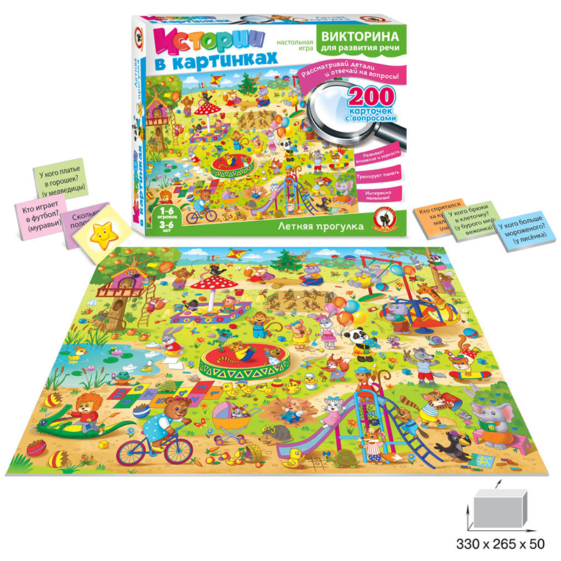 Это полезная развивающая игра с простыми правилами, которая поможет малышам получить больше знаний об окружающем мире, цветах и формах, пополнить словарный запас, развить речь, внимательность, память, навыки порядкового счёта, сравнения чисел и быстроту реакции, научит ориентироваться в пространстве и находить причинно- следственные связи.<br/>В комплекте 200 разноплановых вопросов с ответами для всестороннего развития малышей.<br/>Состав игры:<br/>игровое поле – 1 шт.;<br/>карточки с вопросами – 200 шт.;<br/>правила игры.