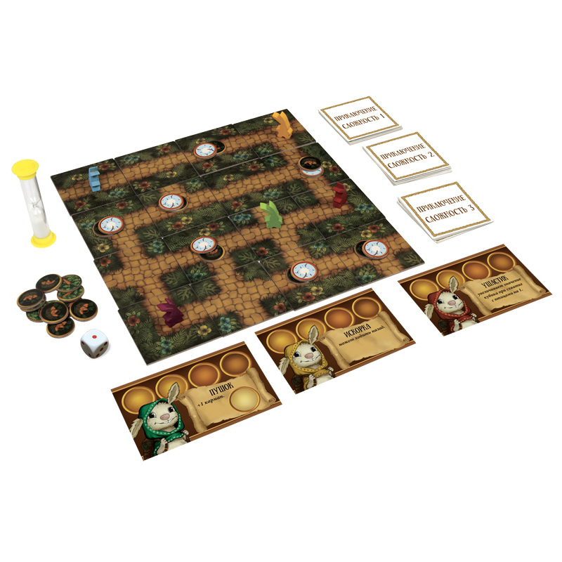 Вначале за определённое время зайцы будут строить игровое поле из сегментов, быстро планируя наилучшие маршруты прохождения и местоположение морковки. Потом поочерёдно перемещать в нём свои фишки зайцев, отгоняя птиц и собирая такую нужную морковку! Вклад каждого игрока невероятно ценен, поскольку победы можно добиться только вместе!<br/><br/><br/>Состав игры:<br/> Деревянные фишки зайцев – 5 шт.<br/> Планшеты героев – 5 шт.<br/> Карточки лабиринта – 35 шт.<br/> Жетоны морковок – 35 шт.<br/> Карточки заданий – 28 шт.<br/> Жетоны птиц – 10 шт.<br/> Песочные часы<br/> Кубик<br/> Правила