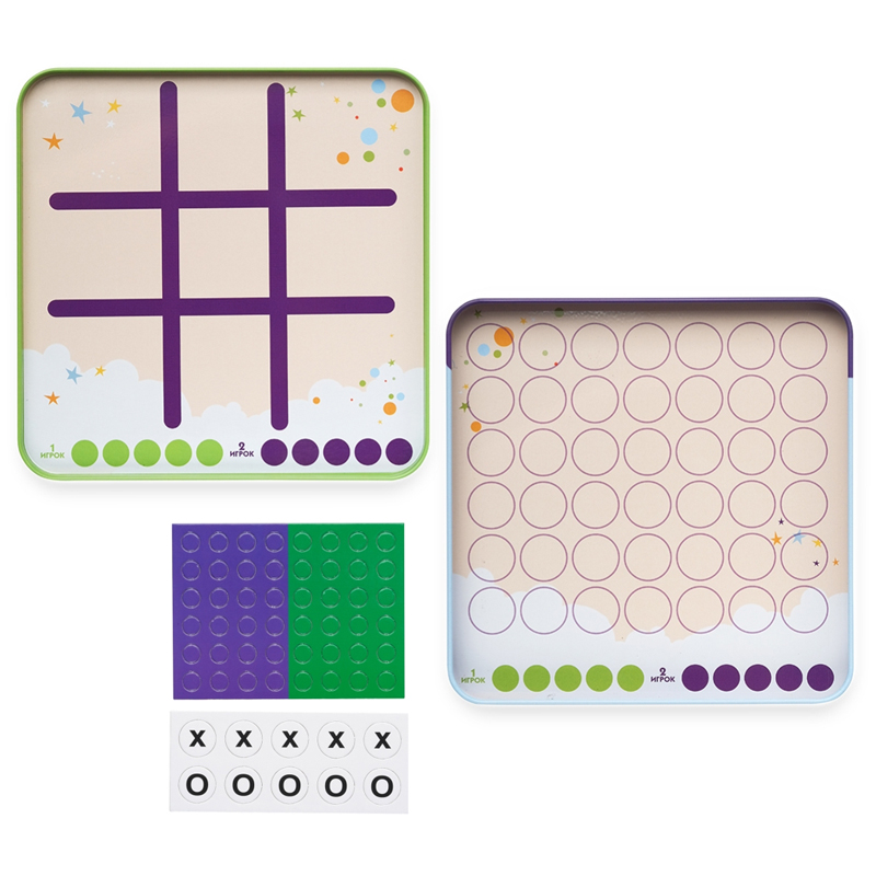 В одном наборе вы найдете 2 самые популярные игры, в которые можно сыграть с другом. Крестики-нолики и 4 в ряд не занимают много времени, зато отлично развивают логику и стратегическое мышление. Попробуйте первым выложить ряд фишек одинакового цвета. Ваш соперник сделает все, чтобы вам помешать!
