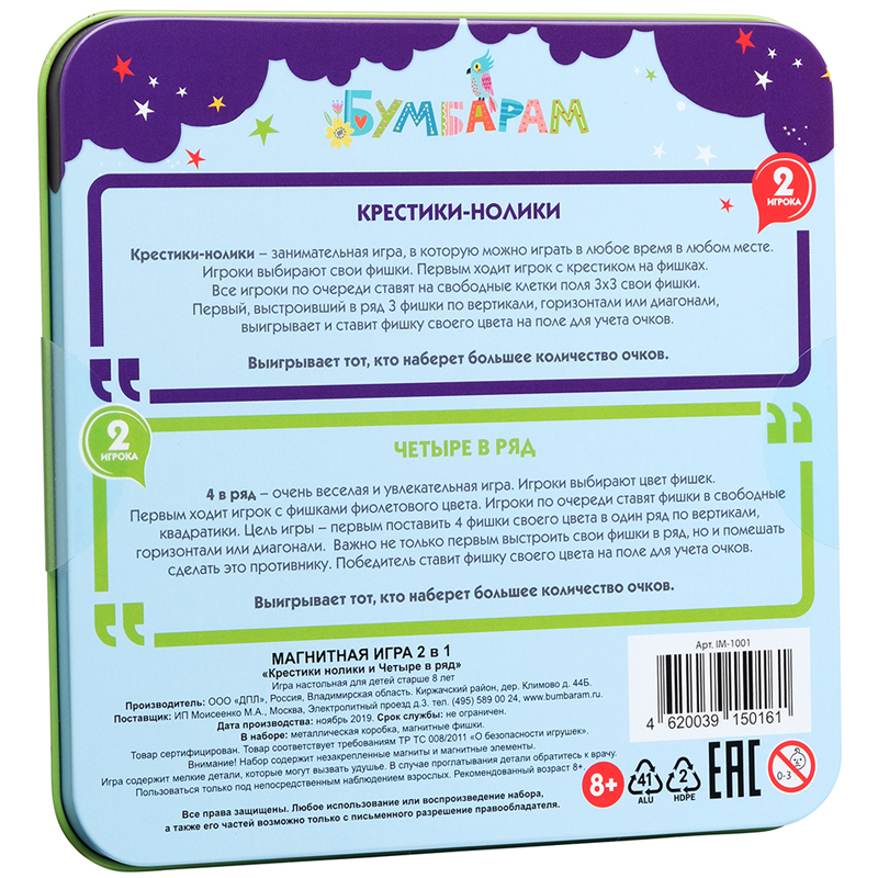 Магнитные игры - это идеальное развлечения для путешествий, дальней дороги, загородного отдыха. Возьмите с собой компактную коробочку и сыграйте там, где вам будет удобно. Все фишки снабжены магнитами, поэтому они держатся на металлическом поле в любом положении. Коробку можно трясти, переворачивать, бросать ничего не потеряется!<br/>В одном наборе вы найдете 2 самые популярные игры, в которые можно сыграть с другом. Крестики-нолики и 4 в ряд не занимают много времени, зато отлично развивают логику и стратегическое мышление. Попробуйте первым выложить ряд фишек одинакового цвета. Ваш соперник сделает все, чтобы вам помешать!<br/>В комплекте: металлическая коробка с магнитным полем, магнитные фишки <br/>Правила игры<br/>Крестики-нолики. Игроки выбирают свои фишки. Первым ходит игрок с крестиком на фишках. Все игроки, по очереди, ставят на свободные клетки поля свои фишки. Первый, выстроивший в ряд три фишки по вертикали, горизонтали или диагонали, выигрывает и ставит фишку своего цвета на поле для учета очков.<br/>Выигрывает тот, кто наберет большее количество очков. <br/>Четыре в ряд очень веселая и увлекательная игра. Игроки выбирают цвет фишек. Первым ходит игрок с фишками фиолетового цвета. Игроки, по очереди, ставят фишки в свободные квадратики. Цель игры первым поставить четыре фишки своего цвета в один ряд по вертикали, горизонтали или диагонали. Важно не только первым выстроить свои фишки в ряд, но и помешать сделать это противнику. Победитель ставит фишку своего цвета на поле для учета очков.<br/>Выигрывает тот, кто наберет большее количество очков.