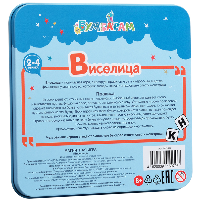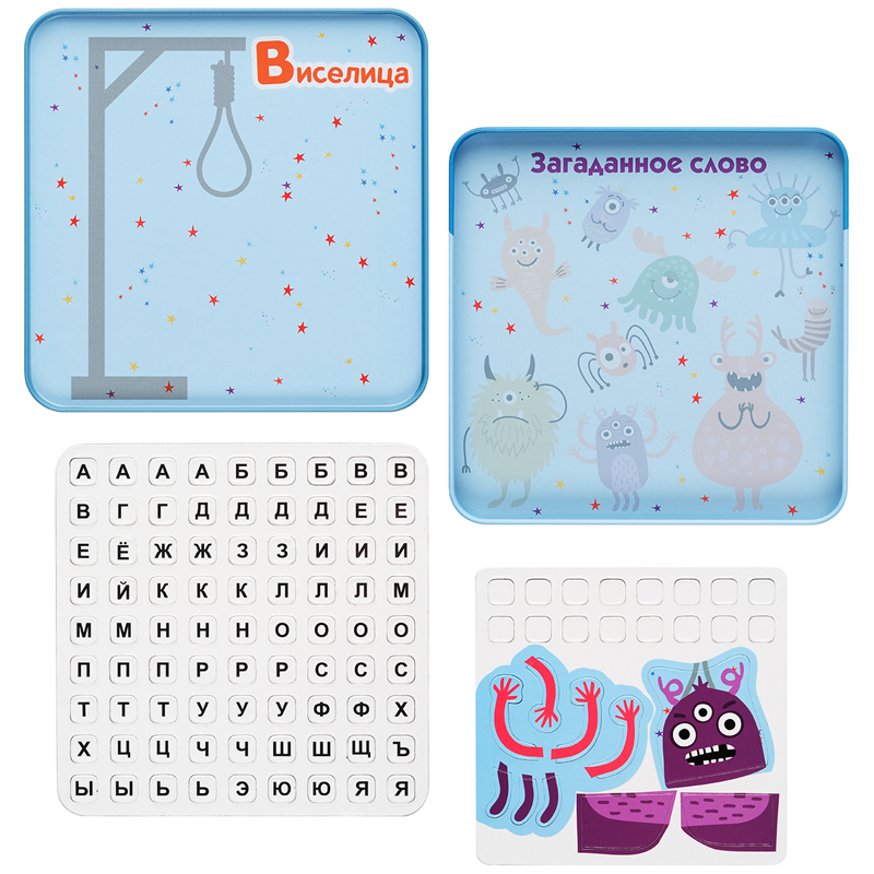Виселица — популярная игра, цель которой угадать слово, загаданное «палачом» и тем самым спасти монстрика. «Палач» придумывает слово и размещает на игровом поле пустые фишки — по одной на каждую букву загаданного слова. Остальные игроки по очереди пытаются отгадать выбранное слово. Если буква угадана правильно, она заменяет пустую фишку. Если нет — «палач» начинает строить из деталей сначала виселицу, а затем монстрика.<br/>В комплекте: металлическая коробка с магнитным полем, магнитные фишки