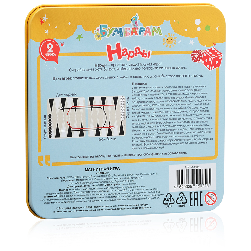 Магнитная игра Нарды классическая настольная игра, которой уже несколько тысяч лет! Ее правила достаточно просты, поэтому после первой же партии их освоит любой игрок. Специальный дорожный вариант магнитную игру в металлической коробке можно взять с собой куда угодно. В наборе уже есть игровое поле, а все фишки снабжены магнитами. Они не упадут с доски, а вы всегда сможете прервать партию и вернуться к ней в любой момент. <br/>В комплекте: металлическая коробка с магнитным полем, магнитные фишки, игральные кубики<br/>Страна производства: Россия<br/>Правила игры<br/>Цель игры: привести все свои фишки в дом, и снять их с доски быстрее второго игрока.<br/>В начале игры, все фишки располагаются в ряд в голове. За один ход с головы можно снять только одну фишку, исключение первый ход. Если в первый ход у игрока выпал дубль, то он имеет право снять две фишки. Фишки движутся по игровому полю против часовой стрелки. Дом, куда нужно завести фишки, находится на противоположной стороне поля. <br/>В свой ход каждый игрок кидает 2 кубика. <br/>Он может ходить одной или двумя фишками на то число очков, которое выпало на кубиках. На одном поле может стоять сколько угодно своих фишек, но если на поле стоит фишка соперника, то ставить свою фишку туда нельзя. Игрок обязан использовать все выпавшие очки. Если у игрока нет допустимых ходов, он пропускает ход. После того, как все фишки заведены в дом, игрок может начать снимать их с доски. Снимать можно фишки, стоящие на позиции, соответствующей количеству очков, выпавших на кубиках. Если таких фишек нет, игрок передвигает фишки с более старших позиций. Если более старших позиций нет, то можно снимать фишки с младших позиций.<br/>Выигрывает тот игрок, кто первым выведет все свои фишки с игрового поля.