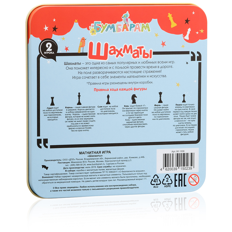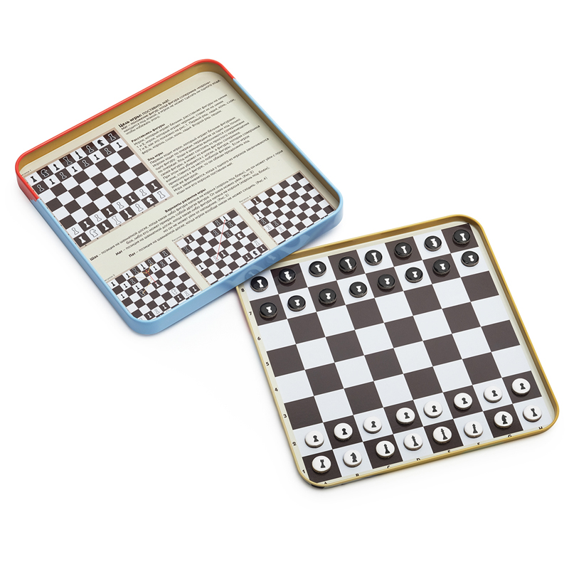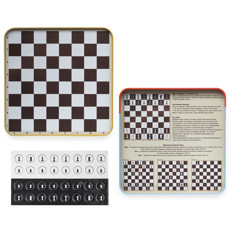 Самая популярная настольная игра на планете шахматы! Каждому стоит научиться ее основам, ведь это отличный способ развить стратегическое мышление, логику и память. Воспользуйтесь магнитной игрой Шахматы , чтобы познакомить ребенка с правилами и секретами шахмат. Она не займет много места в вашем доме, а также легко поместится в любую дорожную сумку.<br/>В комплекте: металлическая коробка с магнитным полем, магнитные фишки<br/>Правила игры<br/>Цель игры: поставить мат. <br/>Мат положение фигур, когда фигура соперника король находится под атакой, а игрок не может сделать ни одного хода, чтобы избежать этого.<br/>Расставляем фигуры. У обоих игроков в начале игры всегда одинаковое количество фигур. Игрок, который играет белыми, расставляет фигуры на линии 1 и 2, игрок, который играет черными, ставит их на линии 7 и 8, как это показано на рисунке №1 (см. рисунок внутри коробки).<br/>Первый ряд: ладья, конь, слон, ферзь, король, слон, конь, ладья.<br/>Второй ряд: пешки.<br/>Ход игры<br/>Первым ходит игрок, который играет белыми фигурами. Игроки ходят по очереди, передвигая за один ход только одну фигуру. Ходы в шахматах выполняются соперниками по очереди. Ход может состоять из простого перемещения своей фигуры, а может из взятия фигуры соперника.<br/>При этом она убирается с доски, а фигура, которая совершила взятие, ставится на место побитой фигуры. Если игрок прикоснулся к фигуре, то он обязан продолжить ход этой же фигурой.<br/>Игра заканчивается, когда у одного из игроков заканчиваются ходы или его королю поставлен мат.<br/>Варианты развития игры<br/>Шах позиция на шахматной доске, когда какая-либо фигура напала на короля (король под боем), но он может уйти с поля боя, либо его может прикрыть собой другая фигура, то есть на следующем ходу хотя бы одна фигура противника сможет взять короля. От шаха можно уйти.<br/>Мат позиция на шахматной доске, когда какая-либо фигура напала на короля (король под боем), но он не может уйти от нападения.<br/>Пат позиция на шахматной доске, когда игрок вообще никак не может сходить. В таком случае это ничья.