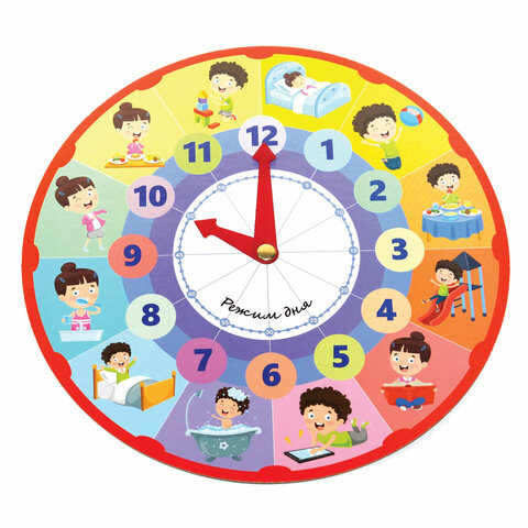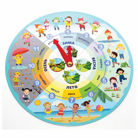 Часы представляют собой двухсторонний циферблат (диаметр – 28,5 см), изготовленный из картона. На часах имеются пластиковые стрелочки – часовая и минутная. С помощью этих функциональных часов ваш ребенок научится определять время, выучит месяцы зимы, весны, лета и осени и весело проведет время за обучением!