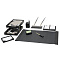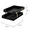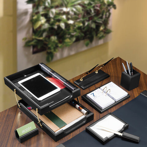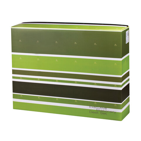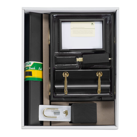 Набор состоит из 8 предметов: двойной лоток для бумаг, коврик для письма (размер – 63х43 см), подставка для ручек (2 шариковые ручки в комплекте), стакан-подставка для письменных принадлежностей, подставка для бумажного блока, подставка для визиток, нож для вскрытия конвертов, подставка для перекидного календаря. Все предметы изготовлены из дерева черного цвета с золотистой фурнитурой. Набор упакован в подарочную коробку, а также дополнительно в защитный гофрокорб для транспортировки.