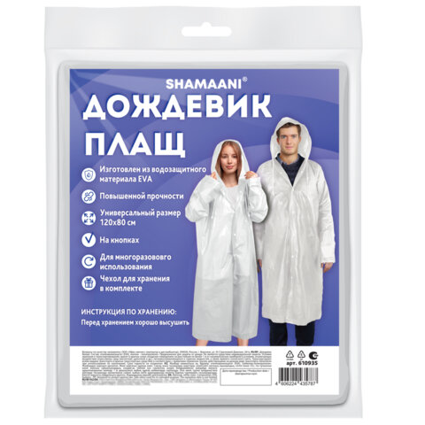 Дождевик-плащ универсального размера с капюшоном изготовлен из этиленвинилацетата (EVA). Поверхность дождевика рельефная. Застёгивается на 6 пар кнопок из полипропилена (PP). В капюшоне есть кулиска с пластиковыми наконечниками.
