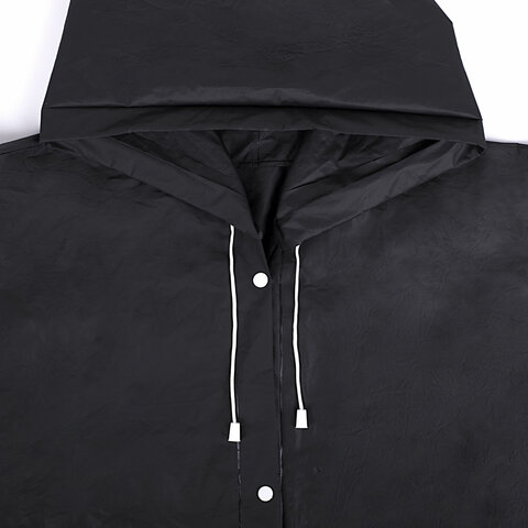 Дождевик-плащ универсального размера с капюшоном изготовлен из этиленвинилацетата (EVA). Поверхность дождевика рельефная. Застёгивается на 6 пар кнопок из полипропилена (PP). В капюшоне есть кулиска с пластиковыми наконечниками.
