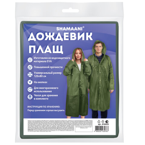 Дождевик-плащ SHAMAANI на кнопках и с капюшоном предназначен для защиты от ветра, дождя и повышенной влажности воздуха. Идеально подойдет для работы на улице, отдыха на природе, рыбалки, пикника и городских прогулок.